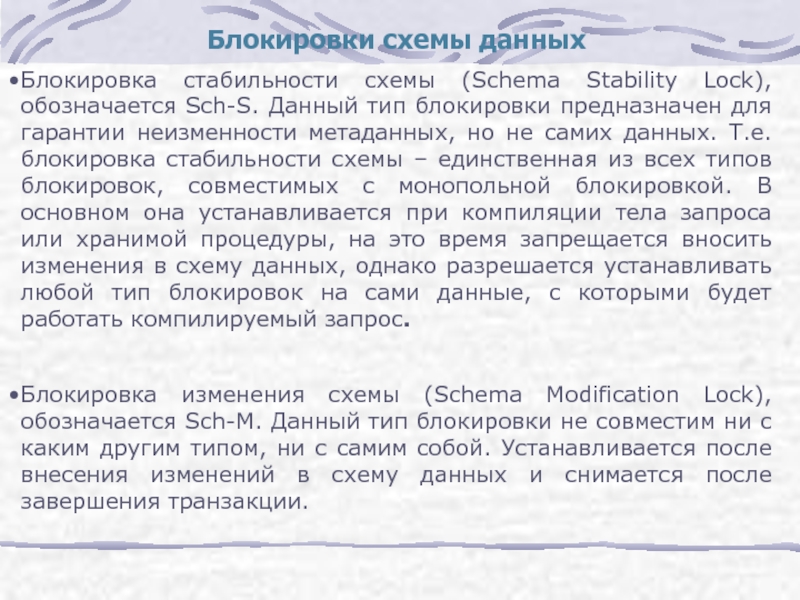 тип блокировки предназначен для гарантии неизменности метаданных, но не самих данных. Т.е. блокировка стабильности схемы – единственная из всех типов блокировок, совместимых с монопольной блокировкой. В основном она устанавливается при компиляции тела запроса или хранимой процедуры, на это время запрещается вносить изменения в схему данных, однако разрешается устанавливать любой тип блокировок на сами данные, с которыми будет работать компилируемый запрос.