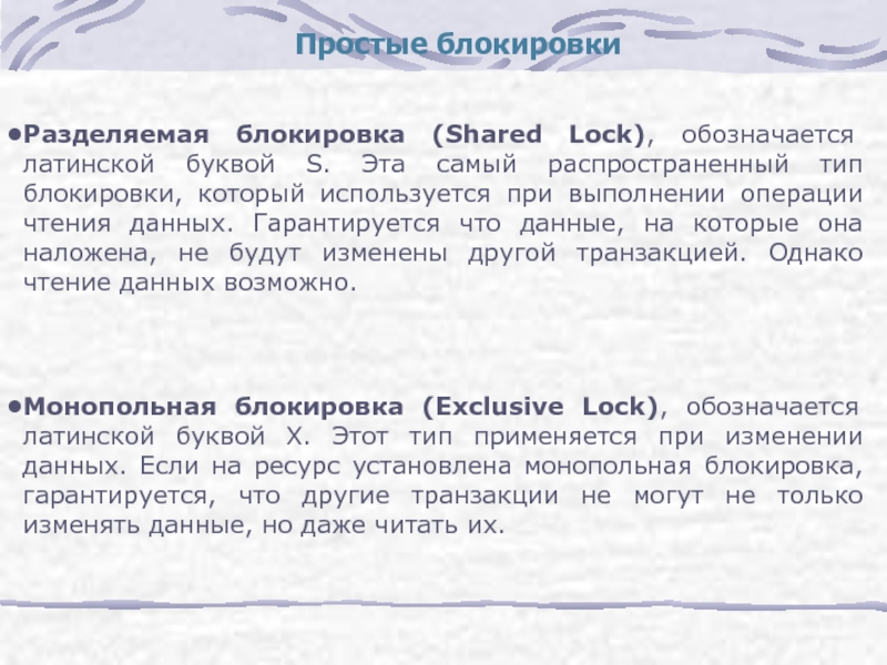 В этом случае другим транзакциям разрешается устанавливать разделяемые блокировки, но не позволяет устанавливать монопольные.