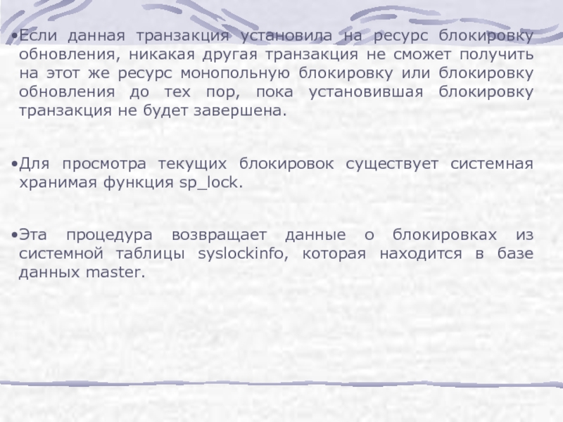 Слайд 18Если данная транзакция установила на ресурс блокировку обновления, никакая другая транзакция