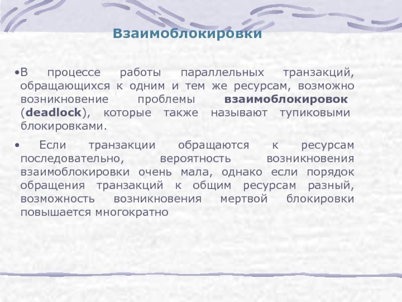 Если транзакции обращаются к ресурсам последовательно, вероятность возникновения взаимоблокировки очень мала, однако если порядок обращения транзакций к общим ресурсам разный, возможность возникновения мертвой блокировки повышается многократно