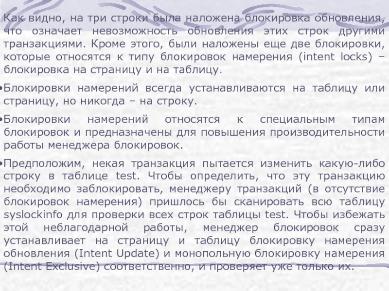 Предположим, некая транзакция пытается изменить какую-либо строку в таблице test. Чтобы определить, что эту транзакцию необходимо заблокировать, менеджеру транзакций (в отсутствие блокировок намерения) пришлось бы сканировать всю таблицу syslockinfo для проверки всех строк таблицы test. Чтобы избежать этой неблагодарной работы, менеджер блокировок сразу устанавливает на страницу и таблицу блокировку намерения обновления (Intent Update) и монопольную блокировку намерения (Intent Exclusive) соответственно, и проверяет уже только их.
