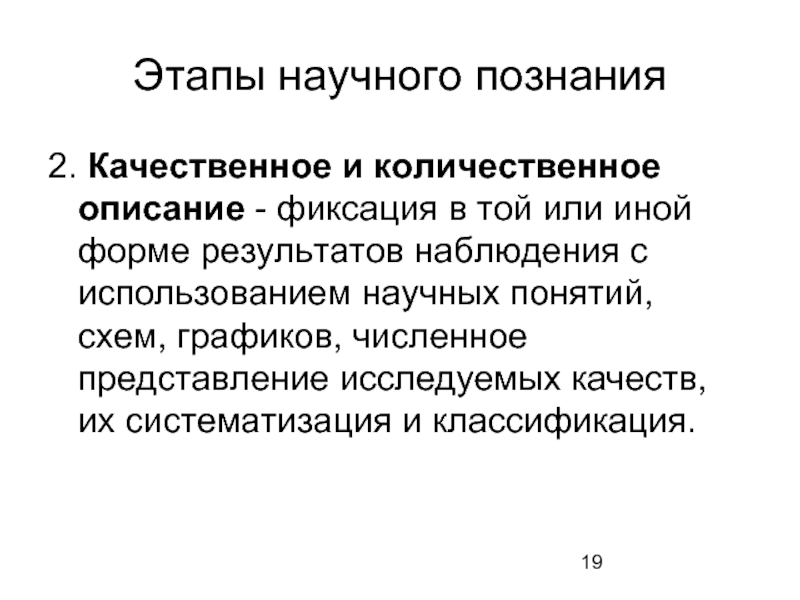 или иной форме результатов наблюдения с использованием научных понятий, схем, графиков, численное представление исследуемых качеств, их систематизация и классификация.