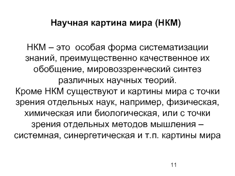 Кроме НКМ существуют и картины мира с точки зрения отдельных наук, например, физическая, химическая или биологическая, или с точки зрения отдельных методов мышления – системная, синергетическая и т.п. картины мира