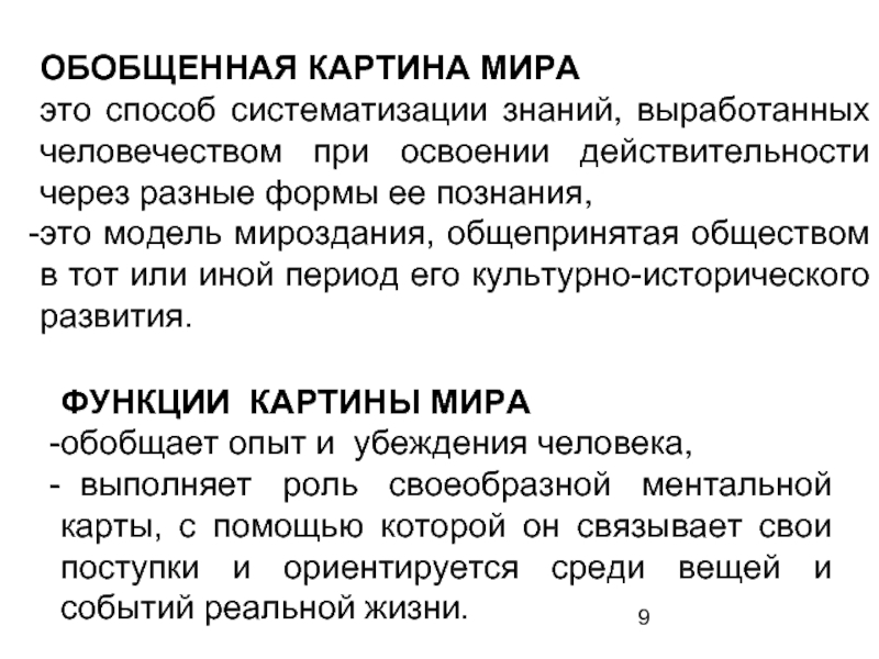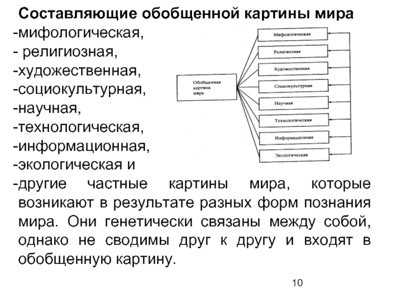 другие частные картины мира, которые возникают в результате разных форм познания мира. Они генетически связаны между собой, однако не сводимы друг к другу и входят в обобщенную картину.