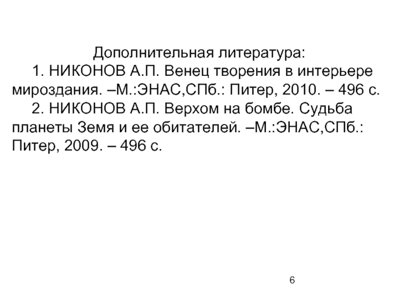 2. НИКОНОВ А.П. Верхом на бомбе. Судьба планеты Земя и ее обитателей. –М.:ЭНАС,СПб.: Питер, 2009. – 496 с.