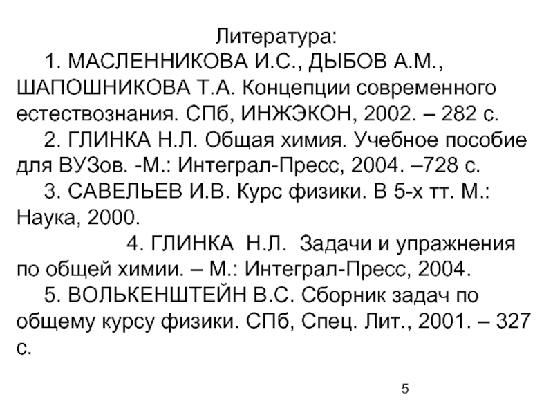 1. МАСЛЕННИКОВА И.С., ДЫБОВ А.М., ШАПОШНИКОВА Т.А. Концепции современного естествознания. СПб,