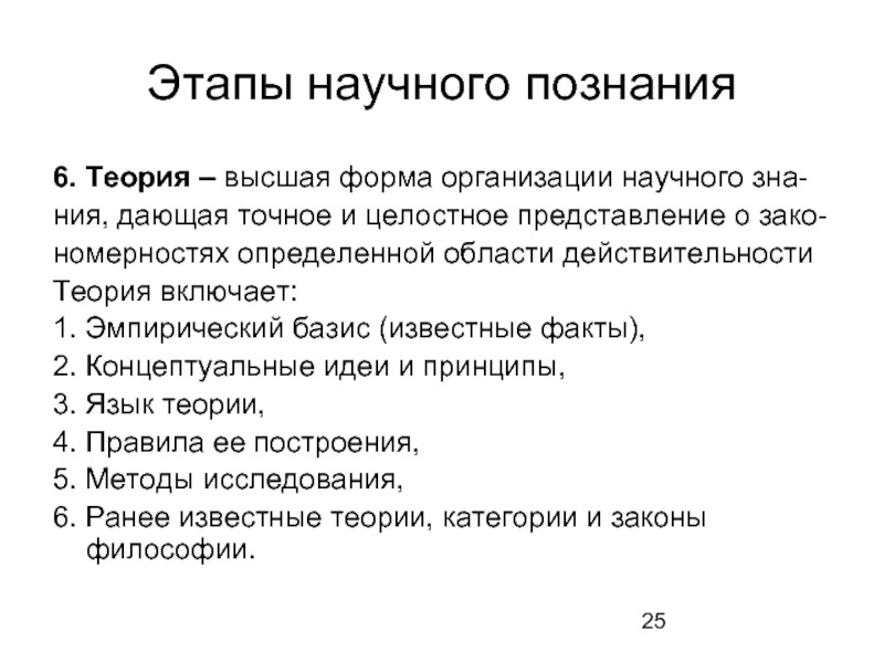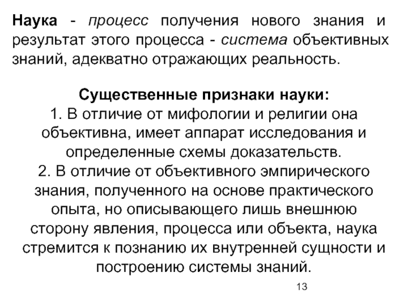 2. В отличие от объективного эмпирического знания, полученного на основе практического опыта, но описывающего лишь внешнюю сторону явления, процесса или объекта, наука стремится к познанию их внутренней сущности и построению системы знаний.