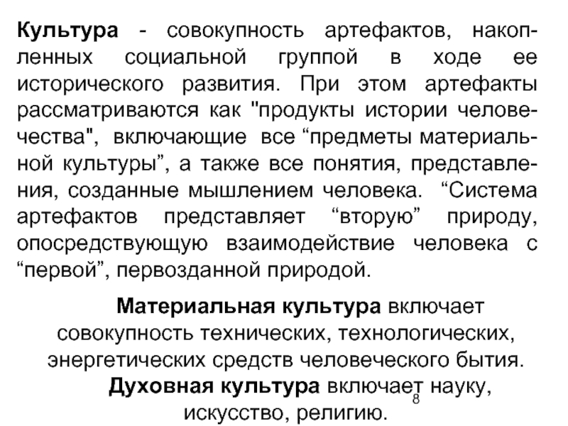 Культура - совокупность артефактов, накоп-ленных социальной группой в ходе ее исторического