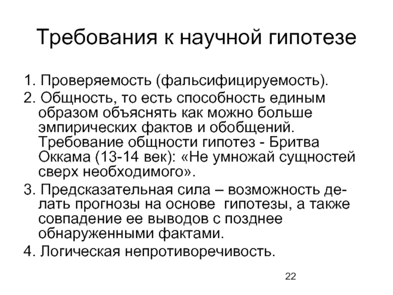образом объяснять как можно больше эмпирических фактов и обобщений. Требование общности гипотез - Бритва Оккама (13-14 век): «Не умножай сущностей сверх необходимого».
