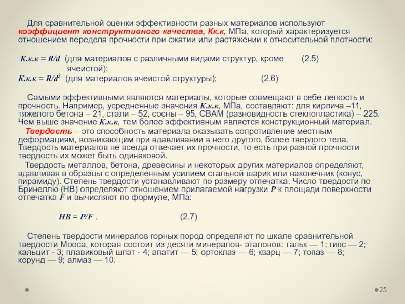 Твердость металлов, бетона, древесины и некоторых других материалов определяют, вдавливая в образцы с определенным усилием стальной шарик или наконечник (конус, пирамиду). Степень твердости устанавливают по размеру отпечатка. Число твердости по Бринеллю (НВ) определяют отношением прилагаемой нагрузки Р к площади поверхности отпечатка F и вычисляют по формуле, МПа: