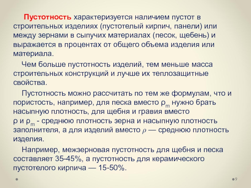 Слайд 9 Пустотность характеризуется наличием пустот в строительных изделиях (пустотелый