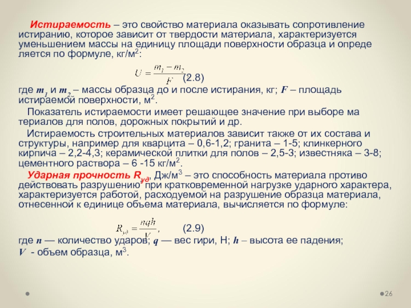 Слайд 26 Истираемость – это свойство материала оказывать сопротивление истиранию, которое