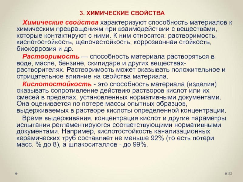 Слайд 30 Химические свойства характеризуют способность материалов к химическим превращениям при
