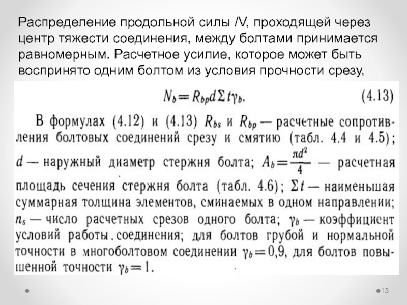 Слайд 15Распределение продольной силы /V, проходящей через центр тяжести соединения, между болтами