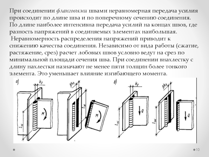 Слайд 10При соединении фланговыми швами неравномерная передача усилия происходит по длине шва