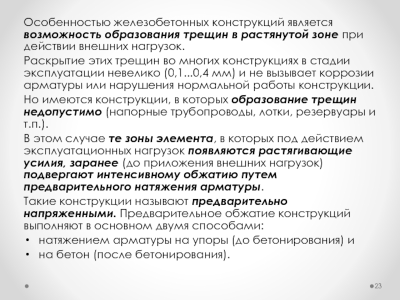 Слайд 23Особенностью железобетонных конструкций является возможность образования трещин в растянутой зоне при