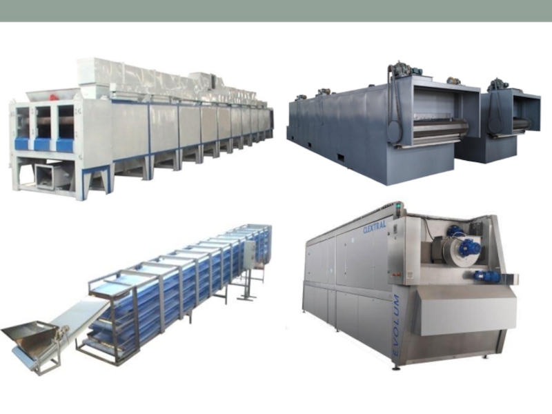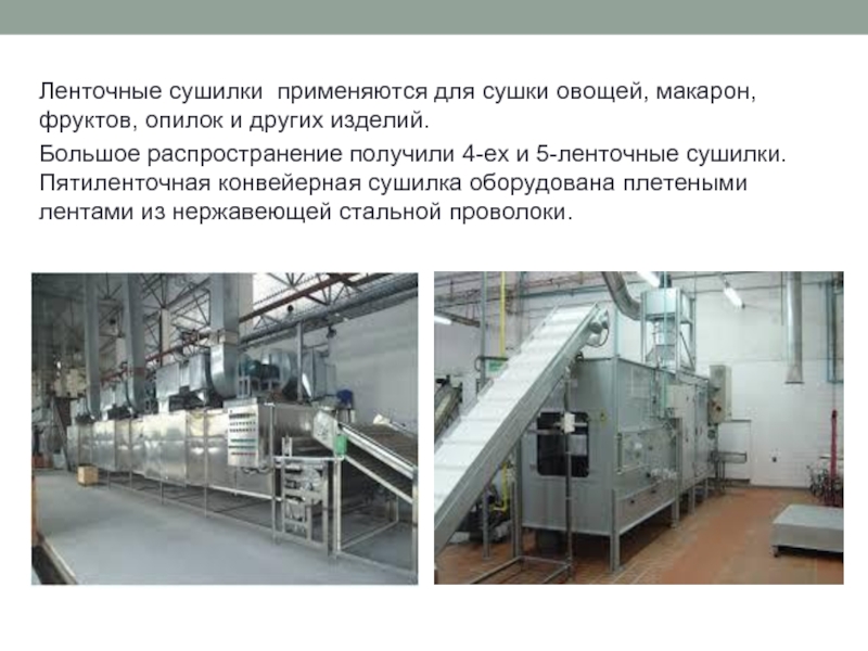 Слайд 8Ленточные сушилки применяются для сушки овощей, макарон, фруктов, опилок и других