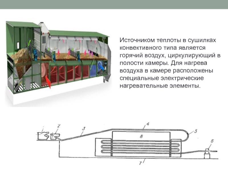 Слайд 7Источником теплоты в сушилках конвективного типа является горячий воздух, циркулирующий в