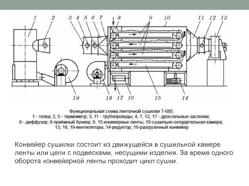 Конвейер сушилки состоит из движущейся в сушильной камере ленты или цепи