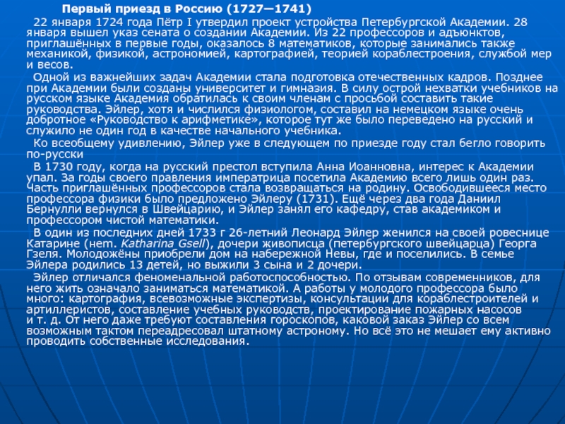 проект устройства Петербургской Академии. 28 января вышел указ сената о создании Академии. Из 22 профессоров и адъюнктов, приглашённых в первые годы, оказалось 8 математиков, которые занимались также механикой, физикой, астрономией, картографией, теорией кораблестроения, службой мер и весов.