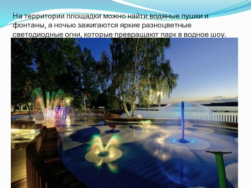 Слайд 4На территории площадки можно найти водяные пушки и фонтаны, а ночью
