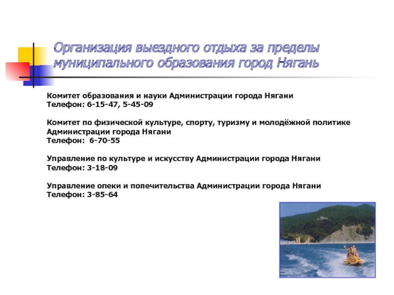 Слайд 10Организация выездного отдыха за пределы муниципального образования город Нягань