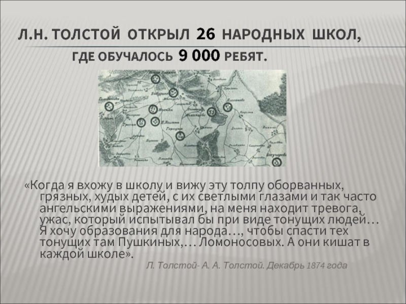 «Когда я вхожу в школу и вижу эту толпу оборванных, грязных, худых детей, с их светлыми глазами и так часто ангельскими выражениями, на меня находит тревога, ужас, который испытывал бы при виде тонущих людей… Я хочу образования для народа…, чтобы спасти тех тонущих там Пушкиных,… Ломоносовых. А они кишат в каждой школе».