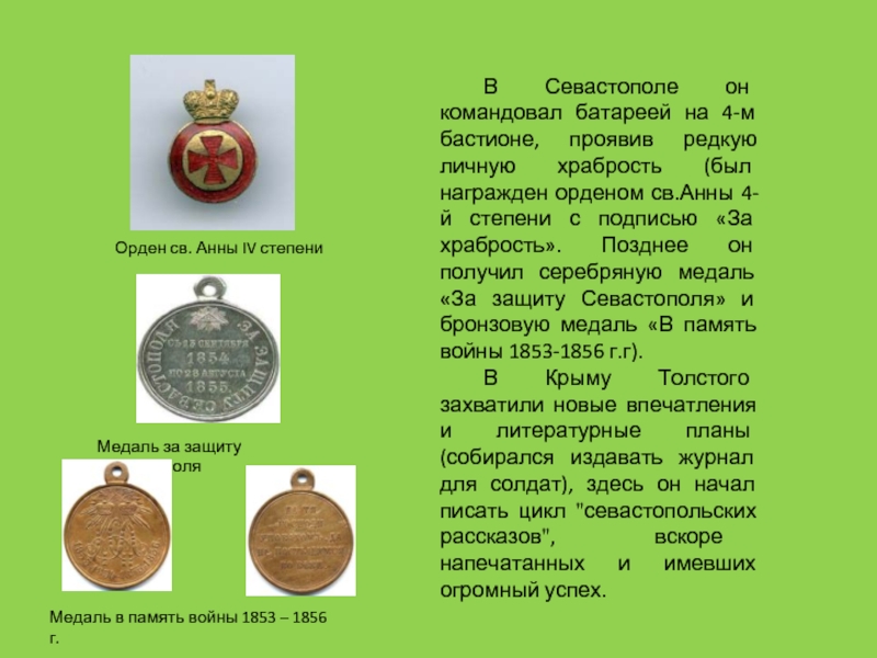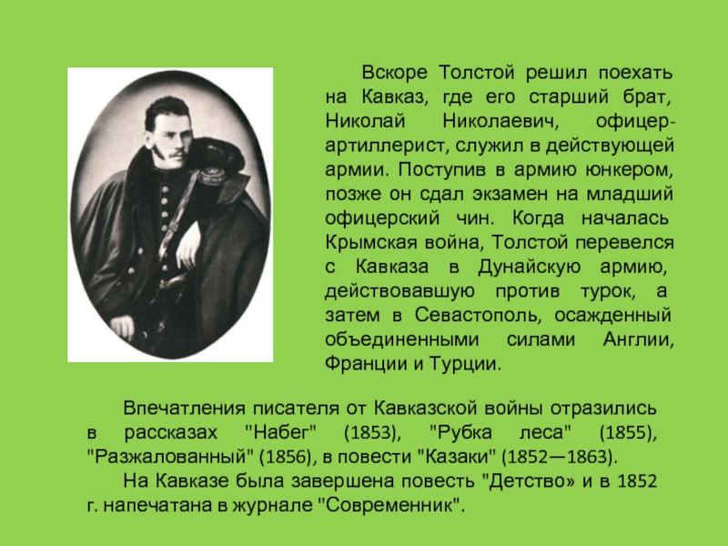 Вскоре Толстой решил поехать на Кавказ, где его старший брат, Николай Николаевич, офицер-артиллерист, служил в действующей армии. Поступив в армию юнкером, позже он сдал экзамен на младший офицерский чин. Когда началась Крымская война, Толстой перевелся с Кавказа в Дунайскую армию, действовавшую против турок, а затем в Севастополь, осажденный объединенными силами Англии, Франции и Турции.