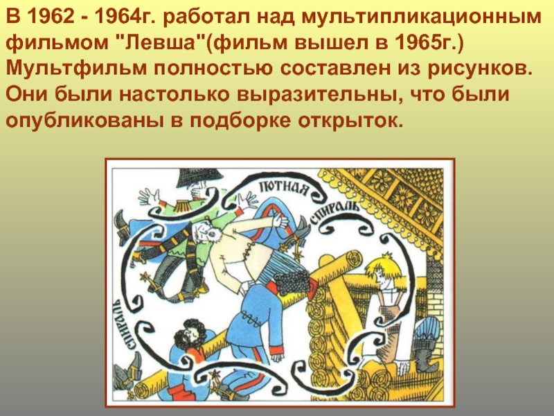 В 1962 - 1964г. работал над мультипликационным фильмом "Левша"(фильм вышел