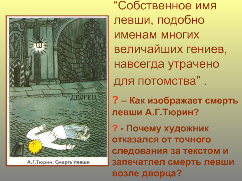 ? - Почему художник отказался от точного следования за текстом и запечатлел смерть левши возле дворца?