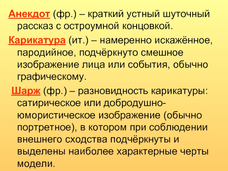 Слайд 4Анекдот (фр.) – краткий устный шуточный рассказ с остроумной концовкой.