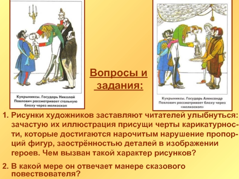 иллюстрация присущи черты карикатурнос-ти, которые достигаются нарочитым нарушение пропор-ций фигур, заострённостью деталей в изображении героев. Чем вызван такой характер рисунков?