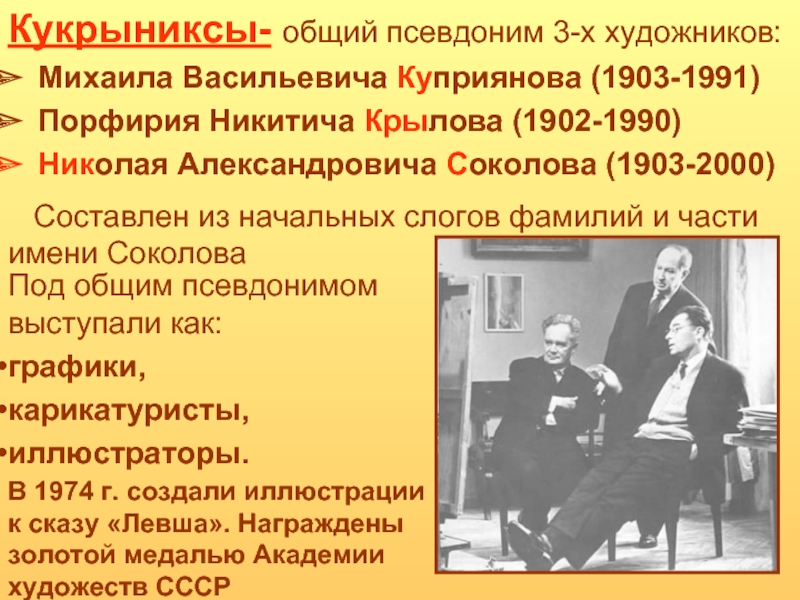 Слайд 5Кукрыниксы- общий псевдоним 3-х художников: