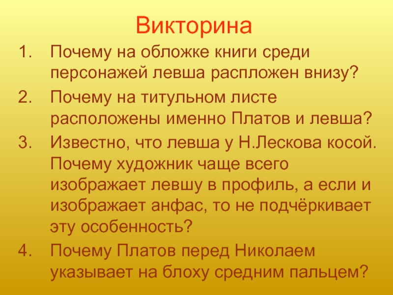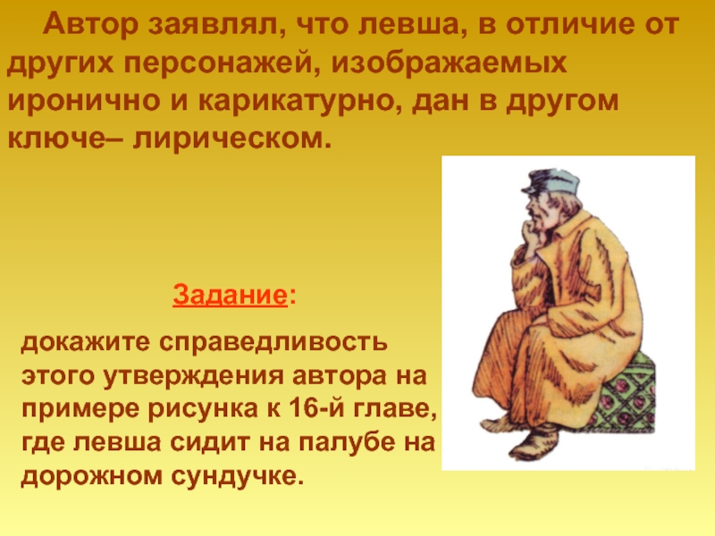 Слайд 16 Автор заявлял, что левша, в отличие от других персонажей, изображаемых иронично