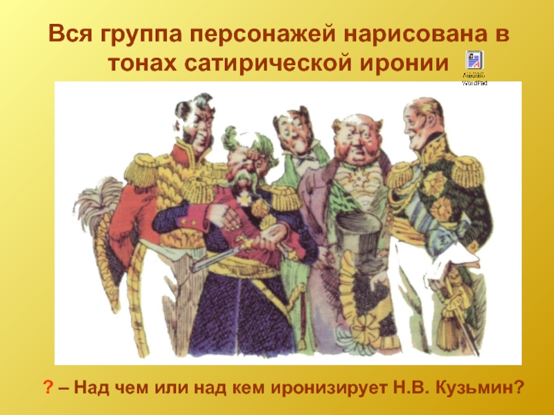 Слайд 12Вся группа персонажей нарисована в тонах сатирической иронии