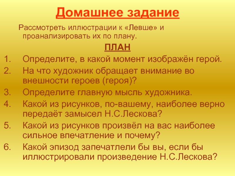 Рассмотреть иллюстрации к «Левше» и проанализировать их по плану.