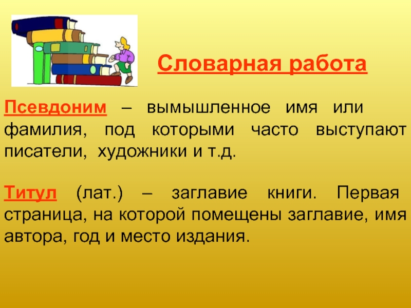 Псевдоним – вымышленное имя или фамилия, под которыми часто выступают писатели, художники и т.д.