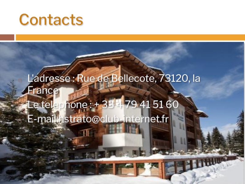 L'hotel se trouve tout pres vers la ligne Cospillot qu'a n'importe quel temps rend possible le patinage sur les skis. Les visiteurs peuvent se regaler des mets delicats etonnants donnes dans le restaurant gastronomique ou casser une croute a l'ami, dispose entre les lignes, mais aussi appartenant Le Strato. Pour la relaxation du soir des locataires, a l'hotel le SPA-ENSEMBLE avec la piscine, le bains. On peut laisser l'equipement de ski dans la piece specialement equipee pour la conservation.