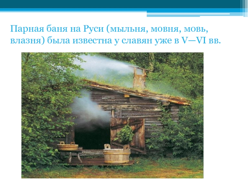 Слайд 58Парная баня на Руси (мыльня, мовня, мовь, влазня) была известна у