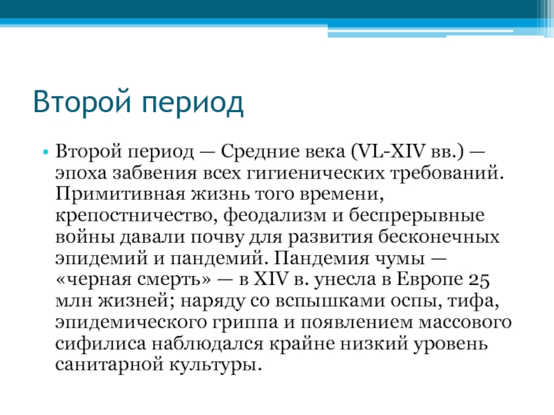 всех гигиенических требований. Примитивная жизнь того времени, крепостничество, феодализм и беспрерывные войны давали почву для развития бесконечных эпидемий и пандемий. Пандемия чумы — «черная смерть» — в XIV в. унесла в Европе 25 млн жизней; наряду со вспышками оспы, тифа, эпидемического гриппа и появлением массового сифилиса наблюдался крайне низкий уровень санитарной культуры.