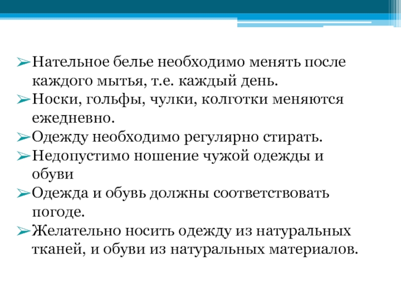 Слайд 21Нательное белье необходимо менять после каждого мытья, т.е. каждый день.