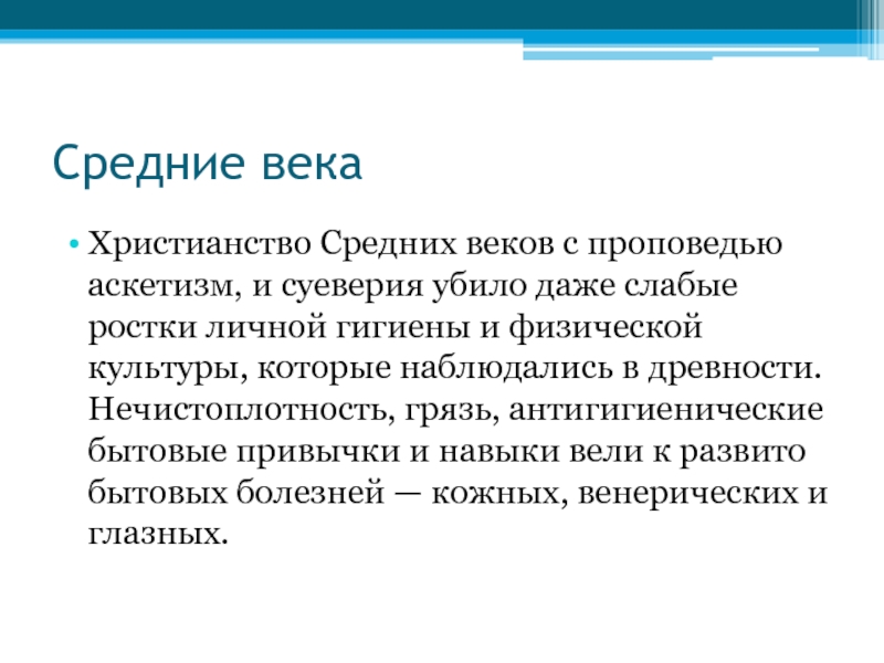 слабые ростки личной гигиены и физической культуры, которые наблюдались в древности. Нечистоплотность, грязь, антигигиенические бытовые привычки и навыки вели к развито бытовых болезней — кожных, венерических и глазных.