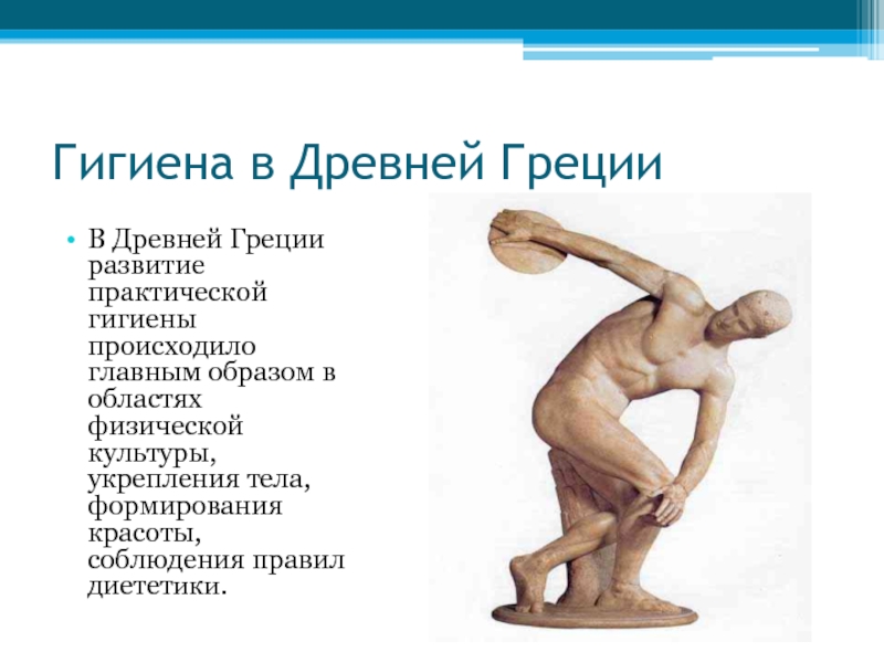 В Древней Греции развитие практической гигиены происходило главным