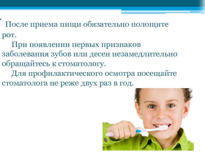 Слайд 16 После приема пищи обязательно полощите рот.