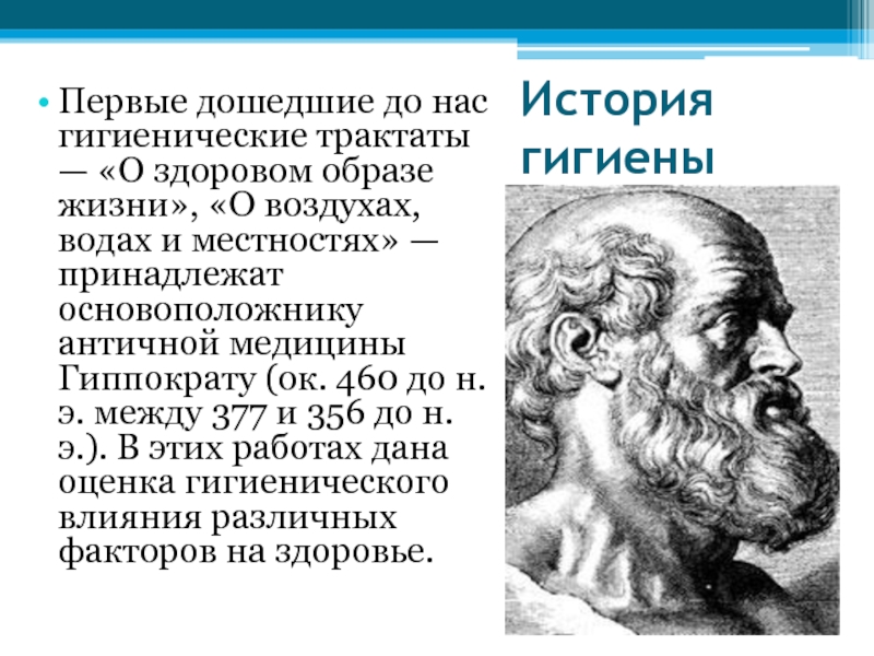 жизни», «О воздухах, водах и местностях» — принадлежат основоположнику античной медицины Гиппократу (ок. 460 до н.э. между 377 и 356 до н.э.). В этих работах дана оценка гигиенического влияния различных факторов на здоровье.