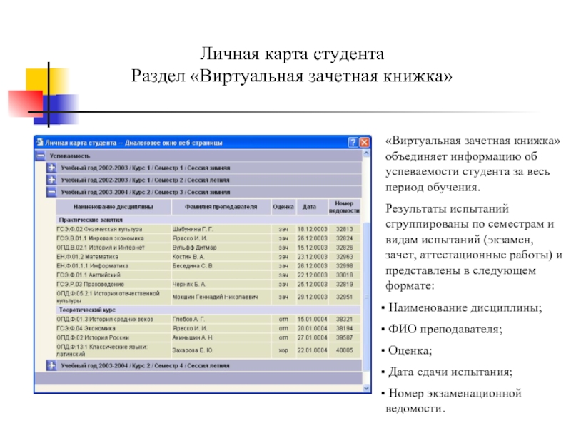 «Виртуальная зачетная книжка» объединяет информацию об успеваемости студента за весь период обучения.