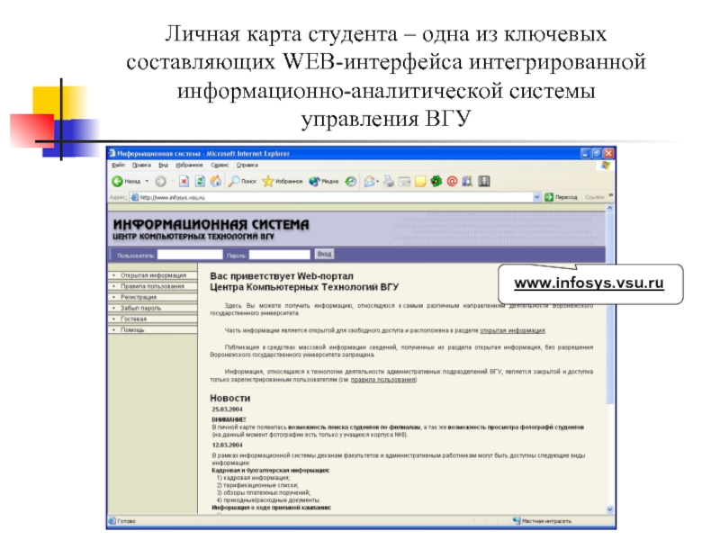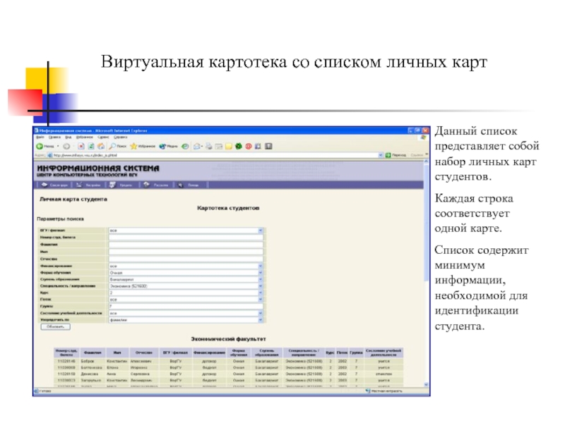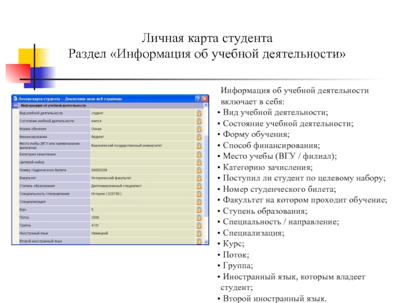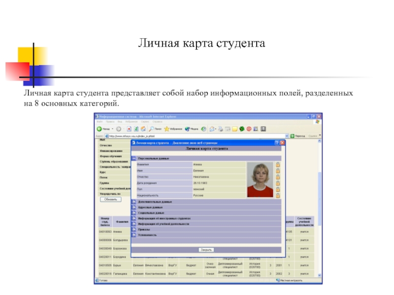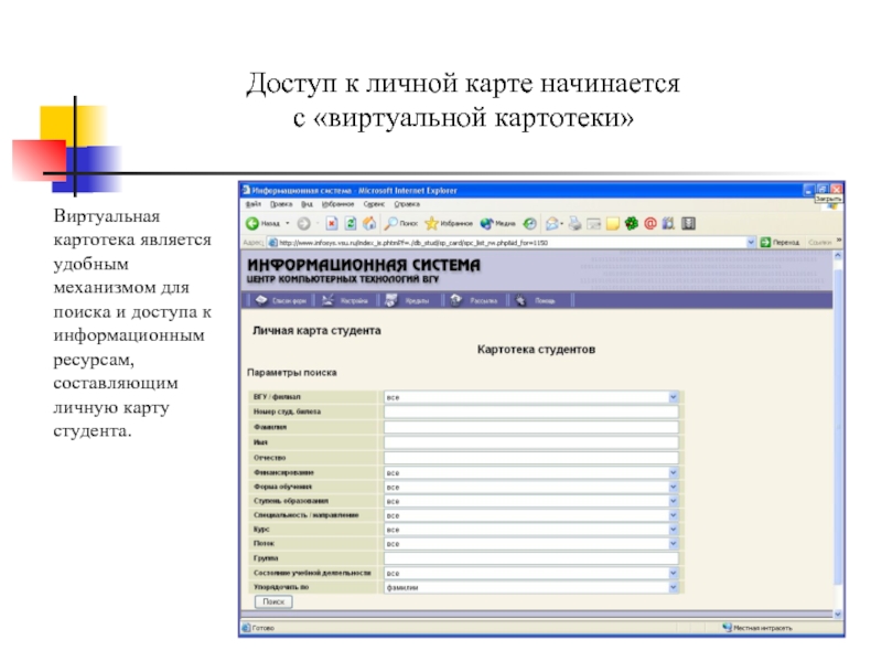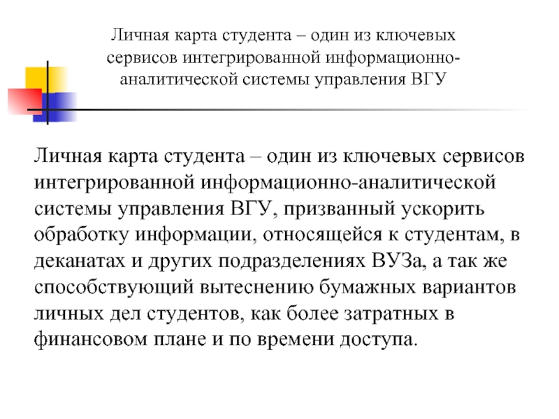 Личная карта студента – один из ключевых сервисов интегрированной информационно-аналитической системы управления ВГУ, призванный ускорить обработку информации, относящейся к студентам, в деканатах и других подразделениях ВУЗа, а так же способствующий вытеснению бумажных вариантов личных дел студентов, как более затратных в финансовом плане и по времени доступа.