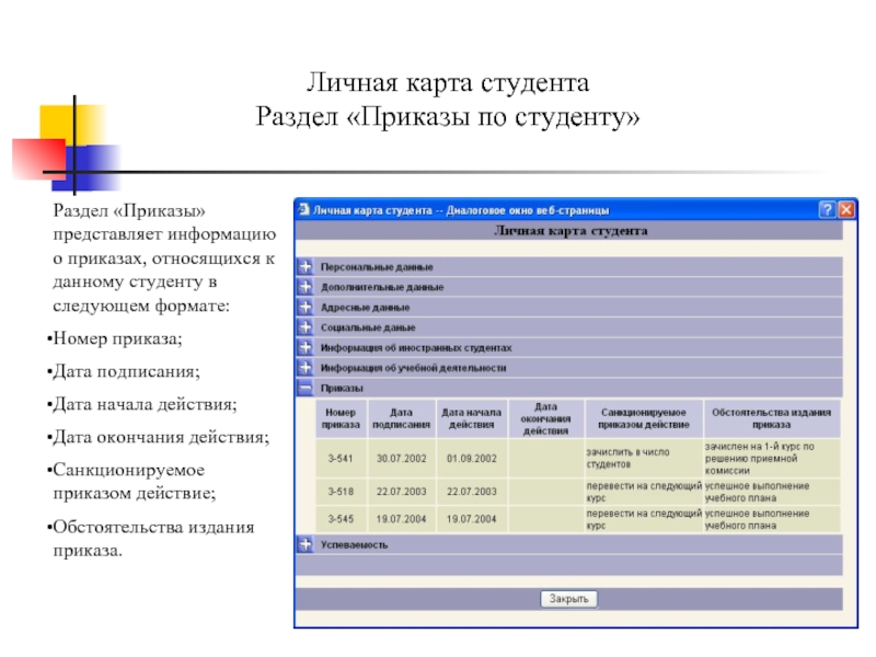 Раздел «Приказы» представляет информацию о приказах, относящихся к данному студенту в следующем формате: