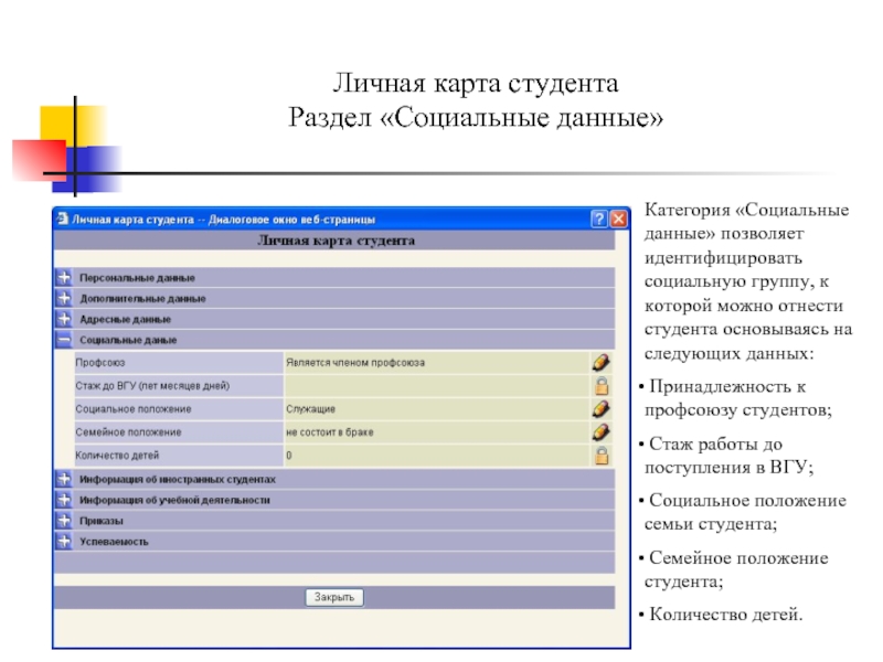 Категория «Социальные данные» позволяет идентифицировать социальную группу, к которой можно отнести студента основываясь на следующих данных: