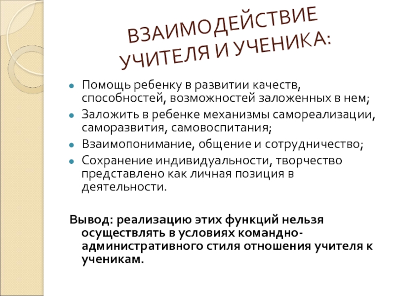Вывод: реализацию этих функций нельзя осуществлять в условиях командно-административного стиля отношения учителя к ученикам.
